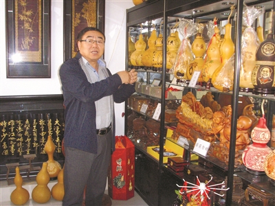 “可别小看这个礼品行,它拓展了我晚年生活的广阔天地呀!如今,礼品行里的商品不仅是葫芦的天地,更有‘新贵’的加盟。‘新贵’是指竹雕、玛瑙饰件、各种材质的手串、山西驴皮影挂、摆件等。其实开这个礼品行,经济效益并不是主要的,最重要的是使我的晚年生活更加充实。”冯德库笑着说。