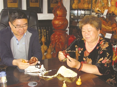 “别看这葫芦不大,却内装乾坤。观时养眼平息心境、把玩于手中更是别有乐趣。我自小就喜爱葫芦,每见到农家园里结出的葫芦,就必寻个拿在手中把玩。那种发自内心的欢喜至今记忆犹新。所以退休后,在姐姐的建议下,我就全身心地投入到了经营葫芦文化中来。让我在其中找到了自我、找到了乐趣,也能为地方文化发展出份力,我十分满足。”今年65岁的冯德库兴致勃勃地对记者说。