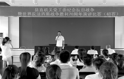 7月30日,镇赉县直机关党工委举行“纪念中国人民抗日战争暨世界反法西斯战争胜利70周年演讲比赛”,来自45个单位的51位选手参加。比赛分初赛和复赛两个环节,各参赛选手在加深认识中国人民抗日战争和世界反法西斯战争的重要意义、践行社会主义核心价值观、实现中华民族伟大复兴的中国梦等方面进行了精彩演讲。图为演讲比赛现场。