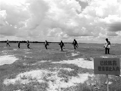 为了有效控制和降低鼠密度、预防鼠害及鼠类传播疾病的发生,切实保障人民群众的身体健康,通榆县苏公坨乡组织干部职工开展了秋季草原灭鼠活动。他们对所辖区域进行拉网式整体推进,合理投放鼠药“2%莪术醇抗生育剂”1.5吨,预计防治面积3000公顷。图为苏公坨村投放鼠药现场。