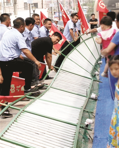 市区海湾路一家幼儿园,将儿童游戏设施放在临街路上,使本并不宽敞的道路被占去大部分。市城管局接到群众举报后赶到现场查看,将占道的圈围拆除。