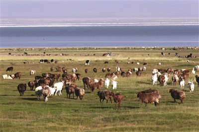 8月24日,牛羊在新疆哈密巴里坤哈萨克自治县草原上觅食。位于新疆哈密地区的巴里坤草原具有得天独厚的生态资源,雪山与草原风光相映成景。