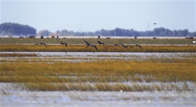 图①数不清的候鸟与白鹤合唱金秋乐章。图②列队回来的灰鹤种群。图③归来的白鹤宛如群仙戏瑶池。图④大雁欢快地飞过芦苇湿地。