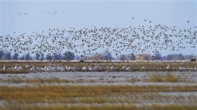 莫莫格湿地位于白城市镇赉县,是吉林省最大的湿地保留地,面积14.4万公顷,被誉为吉林西部之肾,在国际湿地上占有重要地位。它也是东亚鸟类迁徙的重要通道,一江三河滋养着这片神奇的沃土。近几年该区域开展的河湖连通工程和退耕还林、还湿等恢复保护生态举措让该湿地得到了很大的改善和恢复,鸟类的栖息繁衍越来越呈现出繁荣态势。今年10月几十万只候鸟如约而至,在这块湿地上演着一幕幕生态盛宴,场面蔚为壮观。