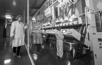 图为10月14日,管延丽(左)在查看富硒米的加工作业。