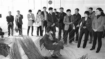 10月16日,白城市委宣传部组织各县(市、区)委宣传部相关负责人及文化产业企业家、艺术家到镇赉县就文化产业发展情况进行考察交流。图为考察团一行在镇赉县博艺柳编公司参观柳编车间。 李雪阳摄