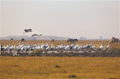 东方白鹳是国家一级保护动物,全球数量不足3000只,比白鹤还希少。它们夏季在俄罗斯东南部和我国东北繁殖(莫莫格和向海都有野生东方白鹳繁殖),冬季迁徙到长江中下游越冬。莫莫格湿地优良的生态环境吸引了它们,目前,近千只东方白鹳在这里停歇,状态良好,预计11月初离境。