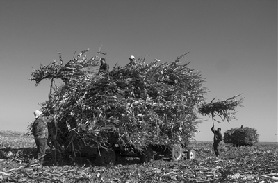 镇赉县在加大对焚烧秸秆行为管控力度的同时,积极引导农户综合利用作物秸秆,主要用作当年牲畜的冬储饲料和第二年农家肥的原料,既最大限度发挥了秸秆的价值,又保护了环境。图为建平乡农民将玉米秸秆打捆装车,准备运回保存。