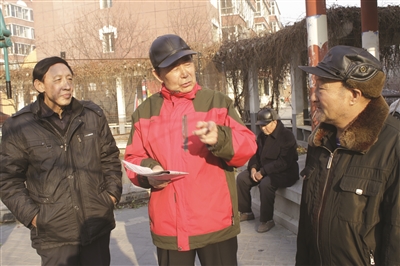 图④白城铁路分局的退休老党员纪连荣(中),家住洮北区明仁街道办事处红叶社区,他正在和社区群众宣讲党的十八届五中全会精神,他说,“十三五”规划会让咱们的日子越来越好。