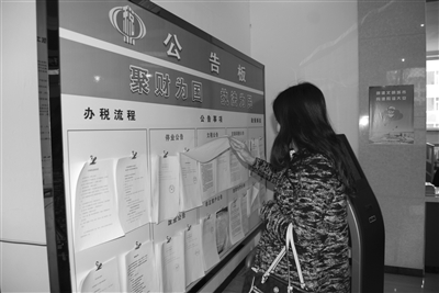 大安市国税局坚持阳光、透明办税,在推行“一机双屏”的同时,又通过“公告板”将办税流程、定额调整、违章处罚等多项纳税人关心的事项通过办税服务大厅设置的公告板公之于众,让纳税人享有广泛的知情权。图为一位纳税人正在对个体户停歇业情况进行察看时的情景。