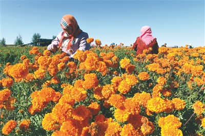 11月16日,在金昌市金川区双湾镇陈家沟村,花农在花卉种植基地采摘万寿菊。