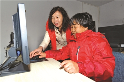 11月17日,安乐社区社工马靖菊(左)教聂淑英老人操作电脑。