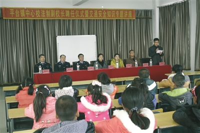 日前,洮北区平台镇中心校举行法制副校长聘任仪式暨交通安全知识讲座。白城市交警支队公路大队经验丰富的交警为中心校师生讲解了校车相关法律法规及校车司机和校车陪护老师的责任,以提高相关人员的安全意识。 本报记者王野村摄