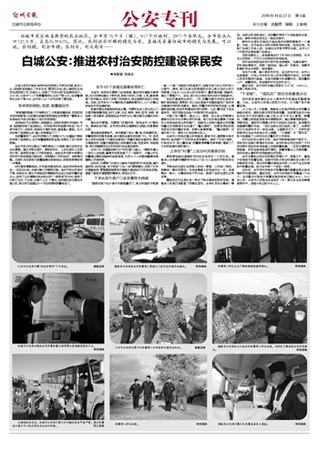 白城公安机关始终将农村治安防控工作抓在手里,放在心头,因地制宜地推出了许多扎实、管用的办法,深入推进社会治安巡逻防控工作,扎根乡土,成就了“平安白城”的品牌和名片。2015年,白城市“110”刑事警情同比去年下降34%,治安警情同比去年下降43%,全市有1205个村屯实现了零发案。