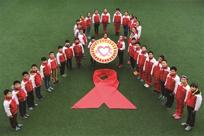 11月30日,安徽省合肥市67中的学生围成红丝带的形状。