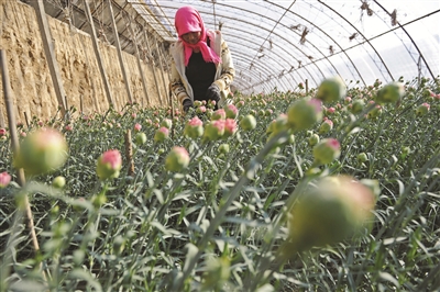 1月2日,兴庆区掌政镇茂盛村农民在大棚里为花卉剪枝。
