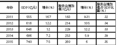 (一)总量快速增长,增加值占比有所提升。“十二五”以来,全市服务业始终保持平稳较快发展态势,2015年全市预计完成服务业增加值260亿元,比上年增长6%,是2011年的1.4倍,按可比价格计算,年均增长7.2%。服务业占GDP比重有所提高,2015年,全市服务业增加值占GDP的比重预计为35%,比“十二五”初期的2011年提高3个百分点。