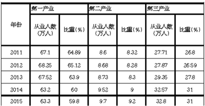 (三)从业人数持续增多。随着全市服务业的快速发展,服务业吸纳劳动力的作用进一步增强。2015年,全市服务业预计吸纳从业人员32.8万人,比2011年净增6万人;服务业吸纳从业人员数量占全部从业人员数量的比重为31%。