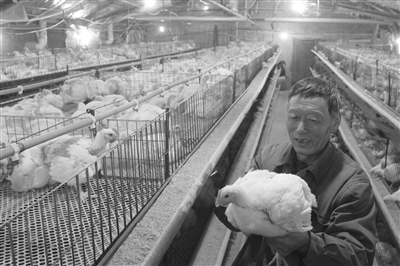 去年以来,大安市通过“公司+贫困户”捆绑经营模式、“合作社+贫困户”抱团合作模式和“家庭农场+贫困户”土地流转模式确保12670人脱贫。图为63岁的村民张财在民意合作社养鸡场打工。 姜伟明摄