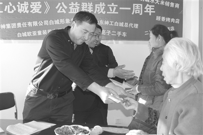 在过去的一年里,“汇心诚爱”公益群本着能将爱心持久、有序、健康发展下去的原则,以每人每月最低10元钱无上限的标准,发展爱心公益活动。洮北区平台镇东五村78岁高龄的康桂珍老人成为公益群的第一个捐助对象;东风中学三年级学生程世强,母亲患病出走,父亲也离家而去,只剩他和体弱多病的二姨相依为命,小世强也成为公益群的捐助对象。截至2015年底,他们共发起爱心捐款12次,捐款金额15572.53元,捐助米面油、衣物、食品等价值2万多元。