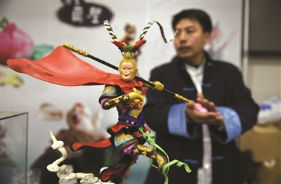 1月17日,面塑传承人张斌在展示他刚刚制作好的《齐天大圣》面塑。