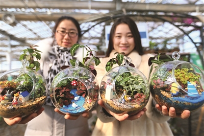 春节临近,山东省即墨市“微景工坊”大学生创客团队推出的“微景观”产品迎来销售旺季。2015年,来自北京工商大学、青岛农业大学、沈阳农业大学等高校的十几名大学生创立“微景工坊”品牌,将国外流行的精细加工、创意设计引入微型景观制作与微型花卉培育中,一年来相继开发出100多款“微景观”产品。 新华社记者梁孝鹏摄