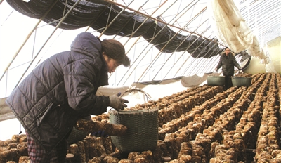 翁瑞伟正在采摘长成的香菇。近年来,洮北区平台镇红塔村为增加农民收入,特聘请浙江丽水农民技术员翁瑞伟传授大棚香菇培植技术,预计一个大棚农民年可增收1万元左右。