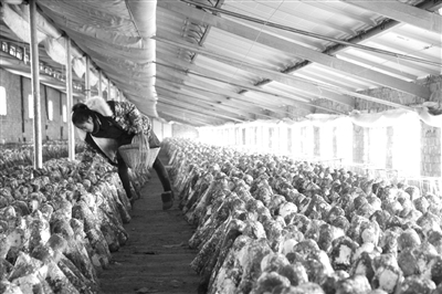2月27日,河南省安阳市内黄县马上乡光伏农业产业园工人在棚内采摘香菇。