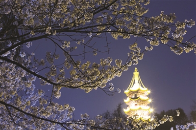 当日是二十四节气的春分,南京鸡鸣寺路两旁盛开的樱花在夜色的衬托下更显浪漫精致,吸引众多游客前来赏樱。 新华社记者王新摄