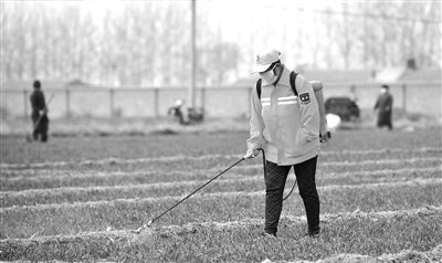 3月22日,河北省吴桥县前李村农民在麦田里喷洒农药。