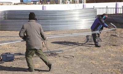 3月25日,工人正在焊接大棚框架。洮北区青山镇黎明村利用专业人才引进蓝莓种植技术,今年投资15万元建设大棚7栋,种植3年后挂果,果实销售渠道畅通,效益十分可观。