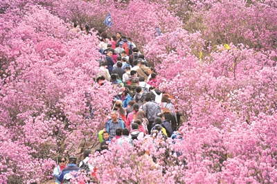 清明节期间,青岛大珠山万亩野生杜鹃进入盛花期,吸引众多游客到此踏青休闲。