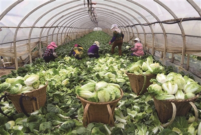 4月5日,云南寻甸七星镇袜笼村的农妇在种植大棚里收获蔬菜。