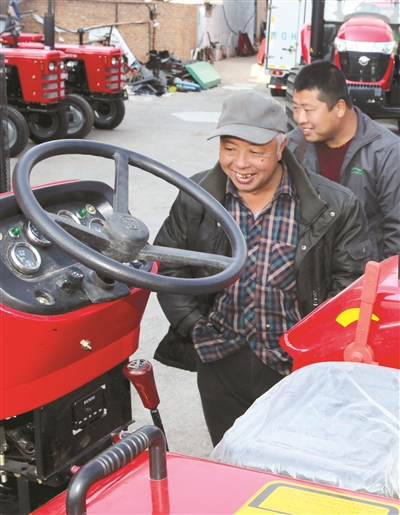 3月31日,通榆县新华镇农民姚连坤看上一台404拖拉机,正在和亲戚研究把它买回家。记者了解到,姚连坤有耕地12公顷,去年种植玉米收入不高,今年调整种植结构,改种辣椒和杂粮杂豆,原来的小四轮不够用了,今天进城来买一台大一点的拖拉机,提高生产力。