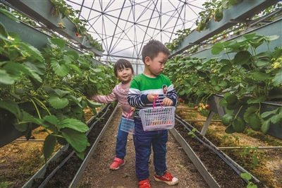 4月9日,孩子们在“花漾星球太空农场”的生态大棚内采摘生态草莓。