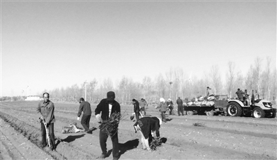 通榆县新华林场以“动作快,质量高”为准则,率先掀起春季抗旱造林高潮。现在他们每天出动50多人、6台车,已打井15眼,抗旱造林37公顷。图为造林场面。 陈宝林 张明摄