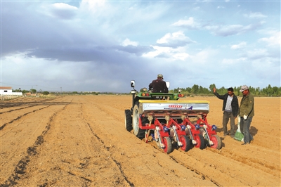5月9日,在位于毛乌素沙地腹地的内蒙古自治区鄂尔多斯市乌审旗苏力德苏木通史嘎查,农民胡格吉勒图家正在用新购的播种机播种玉米。