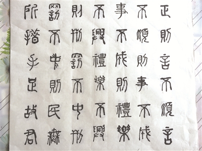 老人告诉记者,自己研习《论语》是有渊源可以追溯的。“我的老父亲爱书法、搞篆刻,受他的熏陶,我从6岁开始对书法、篆刻以及文学产生了兴趣。”小时候的王国华喜欢练字,每逢雨后,经常以蒿秆为笔在白沙碱地上写字。在看到毛主席的题词、报头等墨迹后,便开始细心揣摩,随时用手指在“书空”模仿“毛体”。1958年,王国华以优异的成绩考入了东北师范大学中文系,毕业后便开始从事教师工作。在从教空余时间里,王国华不忘继续学习书法,平时也会注重练习写篆书。王国华认为《论语》中孔子的政治主张、思想道德观念以及一些教育原则都堪称经典,是中国传统文化中不可多得的瑰宝。“《论语》成书是用当时通行的篆字写成并流传下来的,可历史在发展,文化在进步,人们现在看到的《论语》都是简化汉字本,极少看到雕版印刷本和繁体字本。”王国华说,退休前,他曾借教研之机走访了多个城市的图书馆和文庙,都没有看到篆字《论语》和其他古籍,正因如此,王国华便萌发了用篆字书写《论语》的念头。