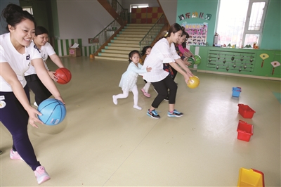 5月30日,白城市道东幼儿园的老师正与孩子一起玩游戏。白城市道东幼儿园十分重视孩子综合素质的培养,经常举办各种类型的亲子活动和师生游戏,让孩子们在玩乐中增加友谊和沟通。 本报记者李晓明摄