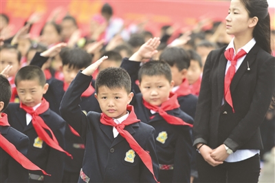 6月1日,六安路小学翠微分校的新少先队员在入队仪式上行少先队礼。