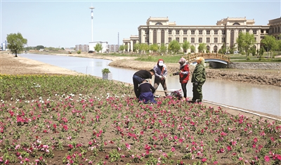 6月12日,园林工人正在移栽鲜花。今年以来,镇赉县围绕“南湖国家城市湿地公园”建设,精心打造一湖碧水、两岸秀色的生态新城区,为市民提供了一个观光娱乐的休闲场所。 本报记者李晓明摄