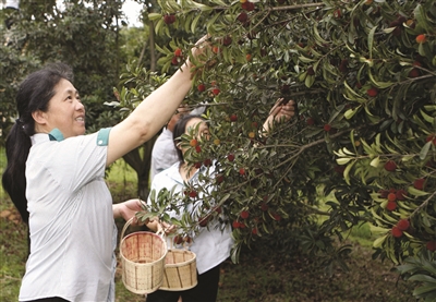 6月18日,工人在开慧镇白沙片区的果园里采摘成熟的杨梅。