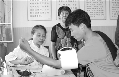 上图 白城中医院医生为洮北区青山镇富裕村农民进行体检。