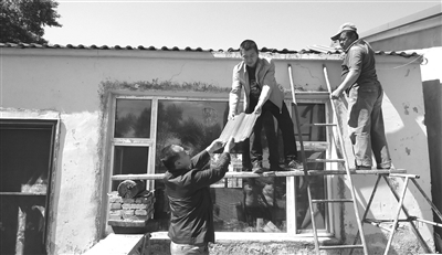 下图 驻村干部为贫困村民李凤琴家维修房屋。 本报记者张殿文摄