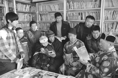 包拉温都蒙古族乡综治协管员张树森(右)自筹资金购买了3000多册图书、2000余册法律和民族政策类书刊,利用自家门市房开办“报吧”。图为张树森在“报吧”组织村民学习政策法律知识。