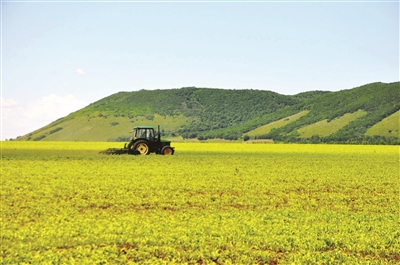 6月26日,黑龙江垦区五大连池农场的一台机车正在地里作业。