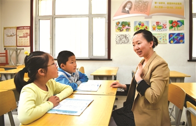 7月5日,志愿者莫红岩(右)在图们市向上街道兴安社区的社区小课堂内为两名留守儿童义务进行辅导。