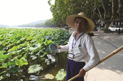 7月25日,负责杭州西湖水域卫生的环卫工人戴云才在岸边打捞垃圾。此时温度计显示气温是37摄氏度。戴云才说:“希望往西湖里乱扔垃圾的游客越来越少”。