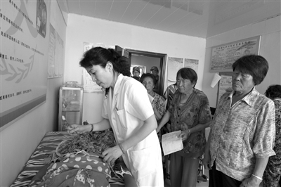 白城医学高等专科学校附属医院以服务大众为宗旨,经常组织医务人员志愿者到社区卫生服务站、农村乡镇,为城乡居民提供诊疗、健康教育、咨询等服务,受到社会好评。图为这个医院志愿者在大安市永乐村免费为群众做心电图。 陈宝林摄