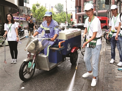 当日,来自同济大学、华东政法大学、上海海洋大学、上海理工大学等高校的70余名学生,来到上海市南京路和人民公园与环卫工人一同清理街道,体验环卫工人的工作。